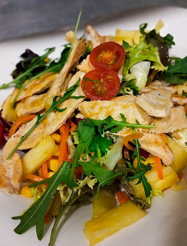 Enciam, pastanaga, blat de moro, pit de pollastre, pinya, ou i salsa rosa