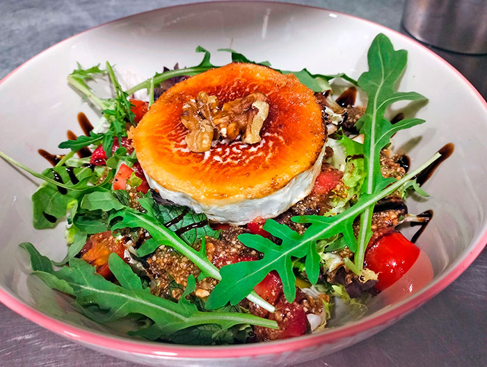 Enciam, nous, panses, poma, maduixes, raïm, codony, magrana, tomates cherry, viagreta i formatge de cabra
