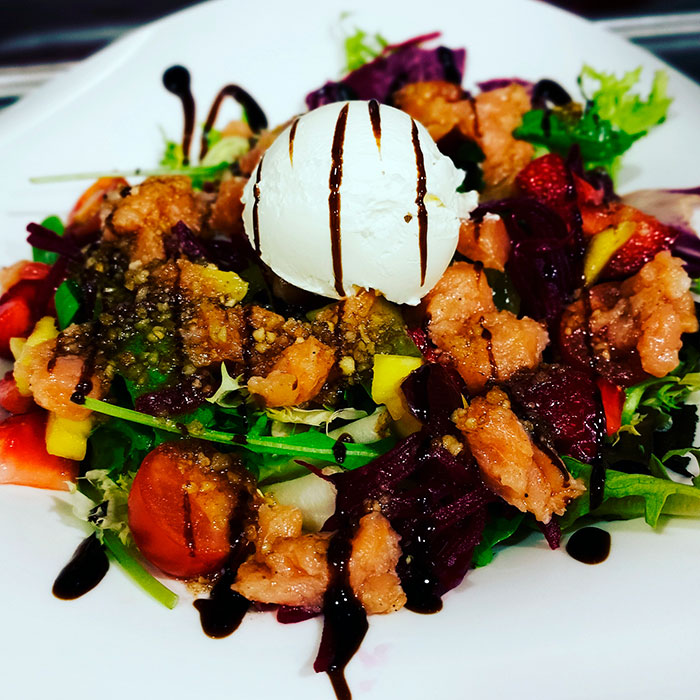 Enciam, tomates cherry, remolatxa, crema de formatge, maduixes, salmó i vinagreta